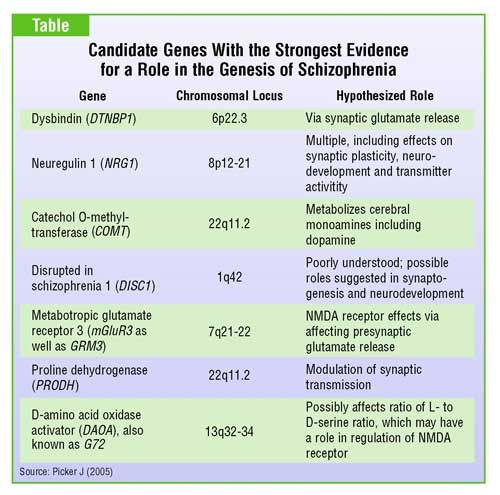 With respect to actual risk genes for schizophrenia, numerous genes have been implicated but the evidence remains spartan. The strongest evidence currently available is for the genes dysbyndin and neuregulin 1 (NRG1) with somewhat less support available for COMT, DISC1, mGluR3, proline dehydrogenase (PRODH), G72, DAO and RGS4 (Harrison and Weinberger, 2005) (Table). The most likely candidates at this time include dysbyndin. This gene, found on chromosome 6p22.3, has widespread distribution throughout the brain. Reduced levels of dysbyndin protein and mRNA expression have been found in the dorsal prefrontal cortex of postmortem brains of patients with schizophrenia (Weickert et al., 2004). The function of this gene is speculative, but it has been suggested that it may be involved in synaptic glutamate release (Numakawa et al., 2004). However, despite studies showing an association, no mutation has yet been conclusively associated with schizophrenia.