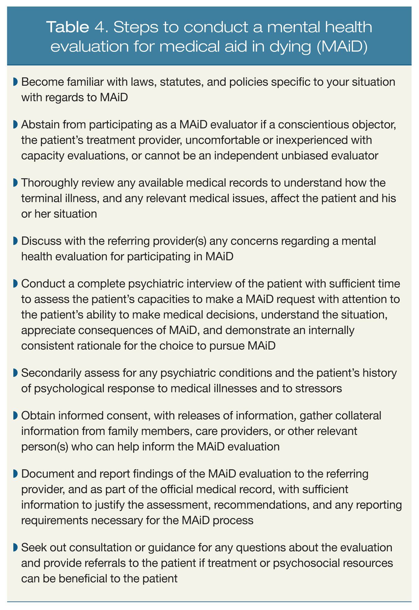 Table 4. Steps to conduct a mental health evaluation for medical aid in dying (MAiD)
