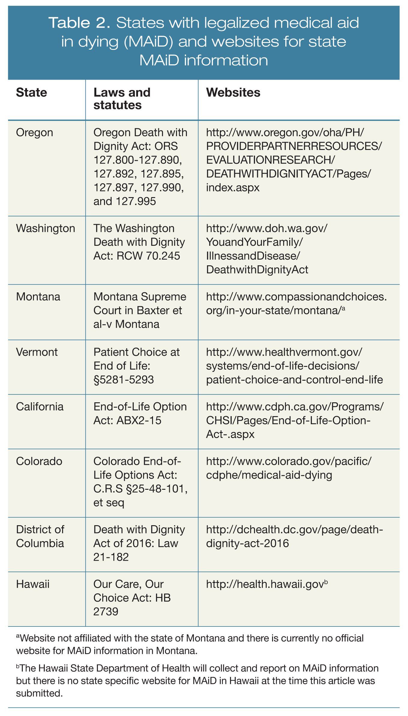 Table 2. States with legalized medical aid in dying (MAiD) and websites for state MAiD information