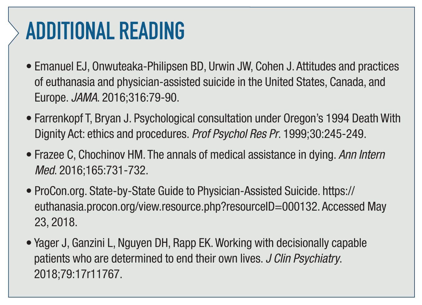 9. American Psychiatric Association. Position Statement on Medical Euthanasia. APA Official Actions. https://www.psychiatry.org/File%20Library/About-APA/Organization-Documents-Policies/Policies/Position-2016-Medical-Euthanasia.pdf. Accessed November 6, 2018.