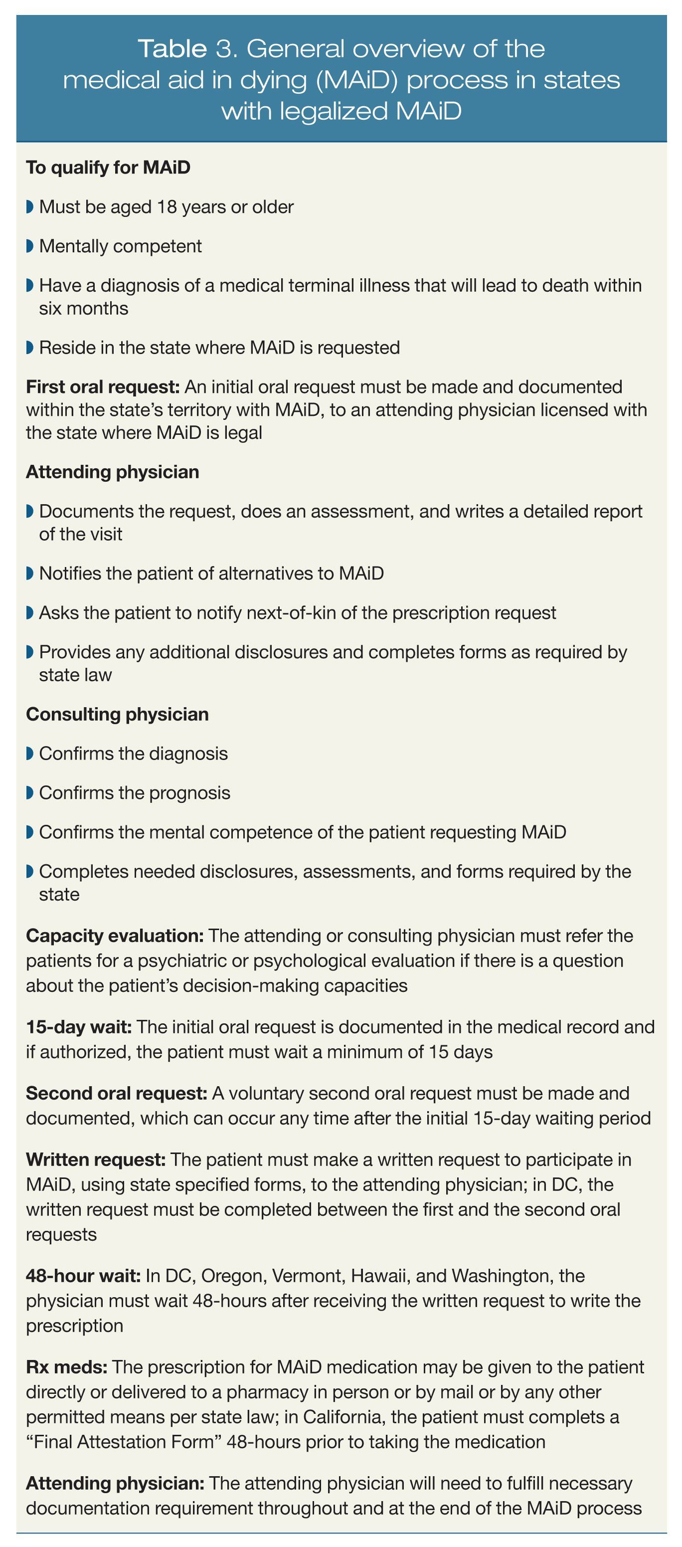 Table 3. General overview of the medical aid in dying (MAiD) process in states with legalized MAiD