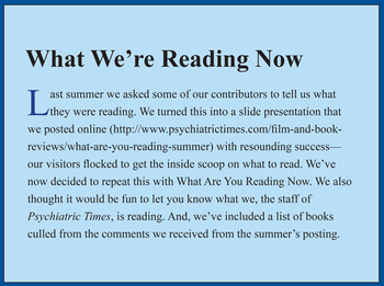 Last summer we asked some of our contributors to tell us what they were reading. We’ve now decided to repeat this with What Are You Reading Now. We also thought it would be fun to let you know what we, the staff of Psychiatric Times, is reading.