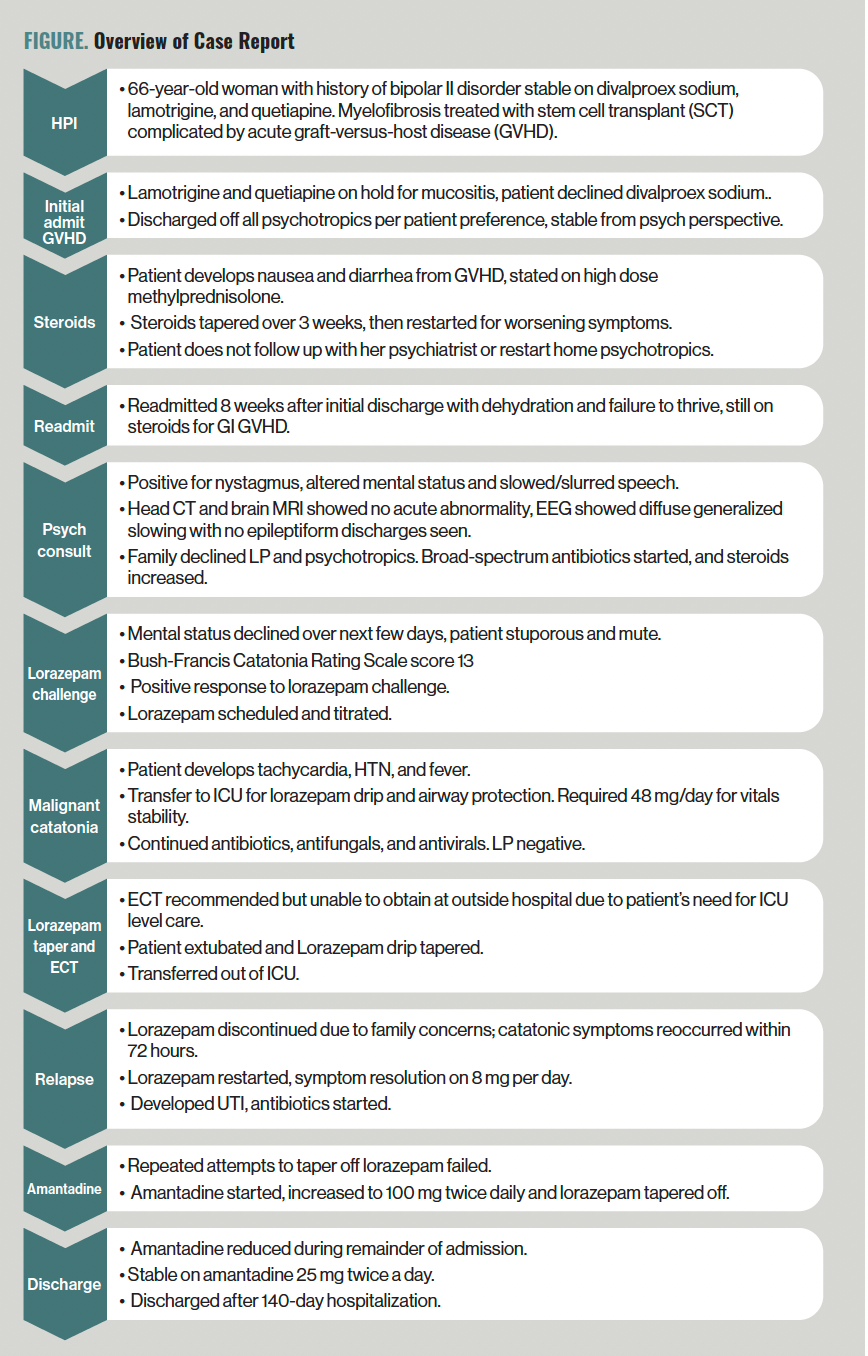 “Ms Elisa” is a 66-year-old woman with a history of bipolar II disorder who had been under the care of a community outpatient psychiatrist and had stability for many years on divalproex sodium 1000 mg daily, lamotrigine 250 mg daily, and quetiapine 25 mg daily. Ms Elisa had a cancer diagnosis of myelofibrosis and was treated with a mismatched unrelated donor stem cell transplant (SCT), complicated by acute graft-vs-host disease (GVHD). During her admission for SCT, the psychiatry consultation- liaison (C-L) service was consulted to assist with management of Ms Elisa’s psychotropics in the setting of severe mucositis/esophagitis and subsequent inability to take medications orally. For treatment of mucositis/esophagitis, Ms Elisa was prescribed dexamethasone 4 mg twice daily for 3 days. At the recommendation of the C-L psychiatry team, Ms Elisa’s lamotrigine and quetiapine were held. Divalproex sodium was recommended to continue at 1000 mg daily with change to intravenous (IV) formulation; however, Ms Elisa declined this, and all psychotropics were held for the remainder of the admission for SCT. At discharge, psychotropics were not restarted based on patient preference. Recommendations were made to have Ms Elisa follow up with her outpatient psychiatrist and to involve psychiatry for assistance and monitoring if she required future corticosteroids (either as an inpatient or outpatient); she was discharged after a 29-day admission and had psychiatric stability.