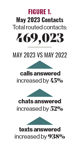According to SAMHSA, the Lifeline receives an average of approximately 350,000 contacts per month. During May 2023 alone, contacts increased by more than 40% in calls, chats, and texts alike compared with the previous year (Figure 1).2