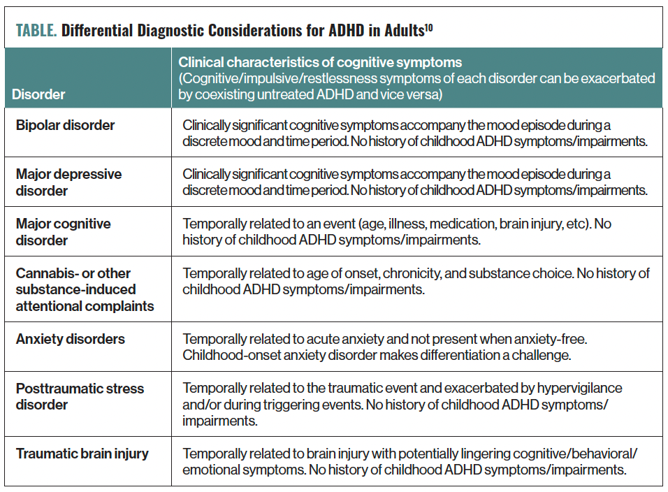 ADHD is a necessary consideration in the differential diagnosis of older adults seeking an evaluation for cognitive difficulties. Diagnostic challenges of differential diagnosis, coexisting disorders, diagnostic prioritization, and treatment sequencing require clinical acumen.