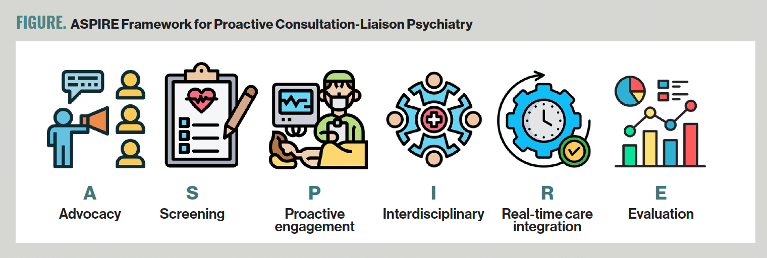 Proactive C-L psychiatry is an integrative care model for medical and surgical inpatients that aims to enhance the value provided to patients, clinicians, and health care systems. The ASPIRE framework highlights key components of proactive C-L psychiatry (
