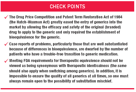 Meeting FDA requirements for therapeutic equivalence should not be viewed as being synonymous with therapeutic identicalness (the same should also apply when switching among generics). In addition, it is impossible to ensure the quality of all generics at all times, so one must always remain open to the possibility of substitution mischief.