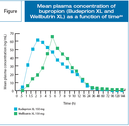 Also determined, but not required for approval, was Tmax, which differed between the 2 products (Wellbutrin XL: bupropion 5 to 6 hours, hydroxybupropion 12 hours; Budeprion XL: bupropion 2 to 3 hours, hydroxybupropion 10 hours) (Figure). The FDA did not consider these differences to be clinically significant because the maximum concentrations did not differ and because the Tmax was similar to that of Wellbutrin SR and slower than that of Wellbutrin IR.