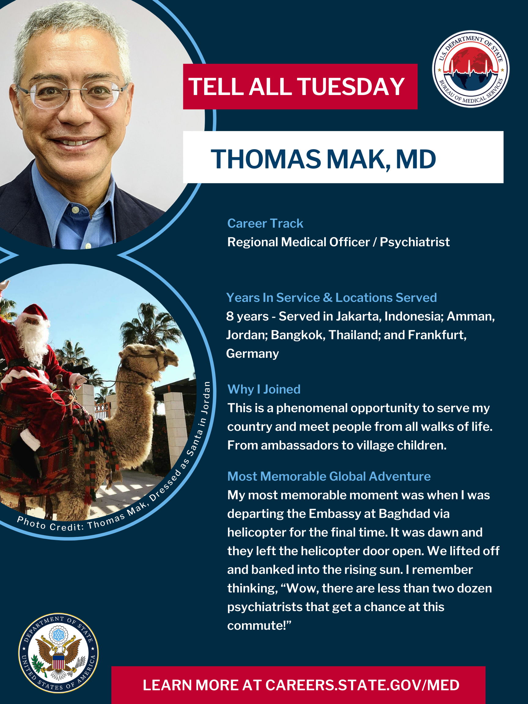 The Department of State – Bureau of Medical Services safeguards the health and well-being of America’s diplomatic community. As s Psychiatrist practicing in the Foreign Service, you are a medical diplomat and will be at the forefront of the Department of State’s mission to deliver the best in preventative and emergency care without the pressure of billing and insurance.