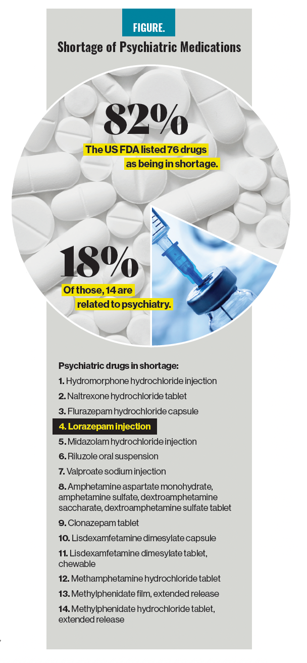 Lorazepam is a widely prescribed benzodiazepine that is used to manage several symptoms off-label, including agitation, aggression, alcohol withdrawal, panic disorder, and catatonia. It bypasses phase 1 metabolism with no active metabolites, is safer to use in patients with hepatic impairment, presents a lower risk of some adverse reactions, and has fewer drug-drug interactions than other benzodiazepines, making it the drug of choice for many clinicians.7 Unfortunately, lorazepam has been in short supply off and on at least 3 times over the past 2 decades, with a median shortage duration of 1436 days.8