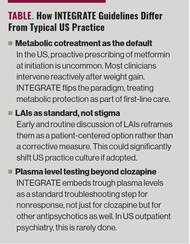 Adopting the INTEGRATE framework in the United States would require a series of important cultural and clinical shifts. Perhaps the most immediate involves rethinking prevention. Too often, US psychiatry waits until metabolic complications emerge before acting, introducing metformin or lifestyle counseling only after weight gain has occurred. INTEGRATE challenges this reactive model by embedding metabolic protection at the outset, treating it not as an adjunctive step but as a fundamental part of antipsychotic prescribing. Framed this way, the guidelines force us to confront the reality that the premature mortality associated with schizophrenia is driven primarily by cardiovascular disease, not psychosis itself.