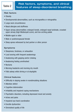 Table 2 lists risk factors, common symptoms, and clinical features of SDB. Many consequences of SDB are also common psychosomatic symptoms. In this case, however, the etiology is well documented and the problem diminishes or disappears when the sleep-disordered breathing is treated.