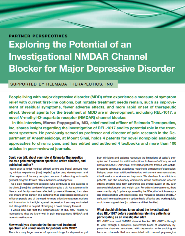 REL-1017 is a novel NMDAR channel blocker. REL-1017 is thought to work through a selective, preferential block of abnormally hyperactive channels associated with depression while avoiding Exploring the Potential of an Investigational NMDAR Channel Blocker for Major Depressive Disorder People living with major depressive disorder (MDD) often experience a measure of symptom relief with current first-line options, but notable treatment needs remain, such as improvement of residual symptoms, fewer adverse effects, and more rapid onset of therapeutic effect. Several agents for the treatment of MDD are in development, including REL-1017, a novel N-methyl-D-aspartate receptor (NMDAR) channel blocker. In this interview, Marco Pappagallo, MD, chief medical officer of Relmada Therapeutics, Inc, shares insight regarding the investigation of REL-1017 and its potential role in the treatment spectrum. He previously served as Professor and Director of Pain research in the Department of Anesthesiology, at Mount Sinai Medical Center in New York City, holds 4 patents for novel nonopioid analgesic approaches to chronic pain, and has edited and authored 4 textbooks and more than 100 articles in peer-reviewed journals. SUPPORTED BY RELMADA THERAPEUTICS, INC PARTNER PERSPECTIVES effects on channels that are associated with normal physiological functions. New data indicate that this unique activity may be related to its preference for NMDARs containing the GluN2D subunit, specifically. With this mechanism, REL-1017 is being evaluated to determine whether it can provide therapeutic effectiveness for patients with depression without the psychotomimetic effects or other cognitive adverse effects that have limited the clinical utility of other NMDAR channel blockers, such as ketamine or MK-801.