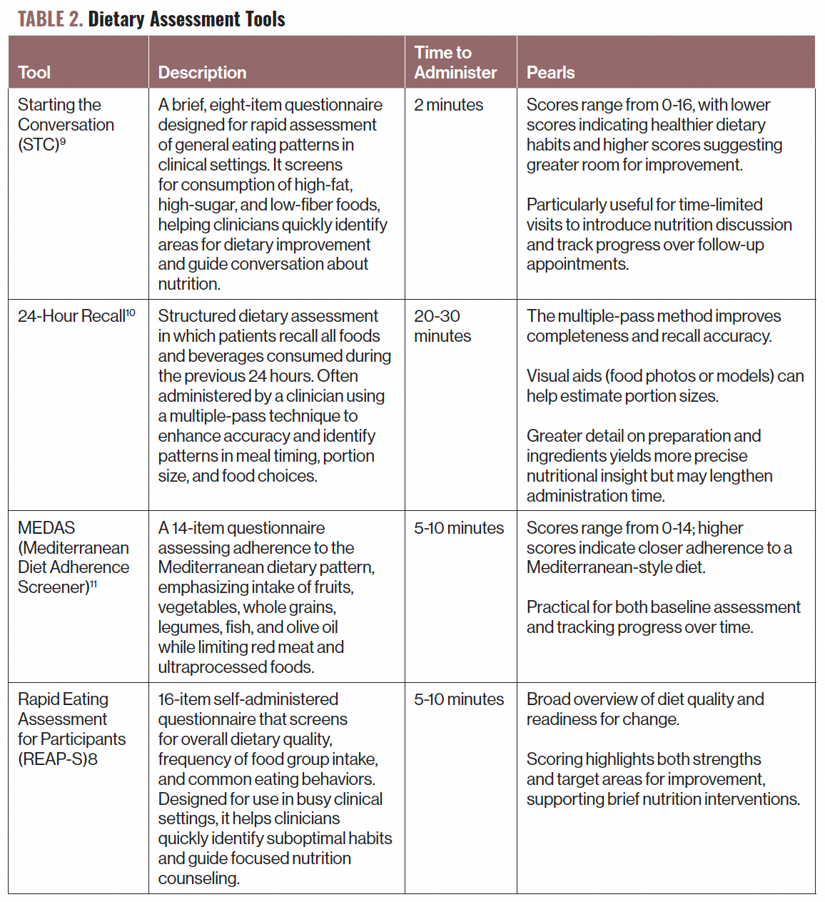 Clinicians often hesitate to assess nutrition due to time constraints or limited formal training; however, many screening tools are available, ranging from 2 to 30 minutes, that can help identify major deficits (