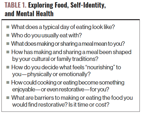 This approach aligns with the field of positive psychiatry, emphasizing agency and meaningful activity as therapeutic drivers.7 Reframing a meal as self-nourishment rather than restriction transforms eating into a small but potent behavioral intervention. This shift allows patients to experience self-efficacy, which can be especially valuable for those struggling with anhedonia or low motivation.