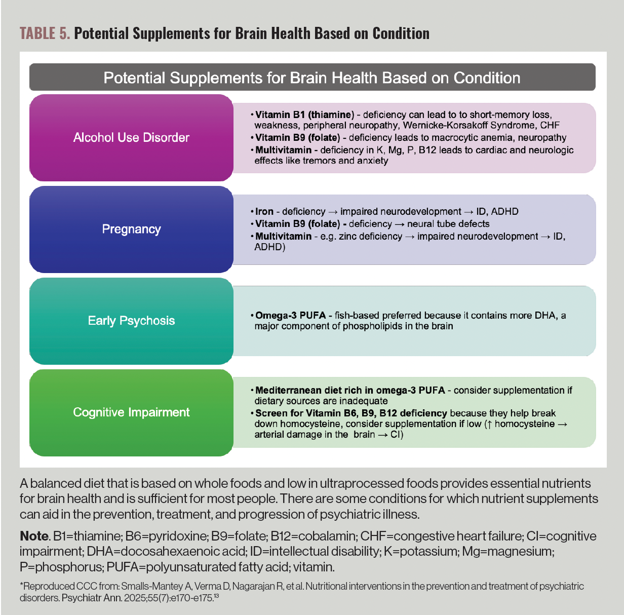 Overwhelming evidence shows that a well-balanced Mediterranean-style diet can mitigate the symptoms of many mental health disorders, such as mood disorders, psychotic disorders, attention-deficit/hyperactivity disorder, intellectual disability, substance use disorders, and cognitive impairment.12 However, certain conditions have been shown to worsen with specific nutrient deficiencies and can benefit from supplementation, including alcohol use disorder, pregnancy (for neurodevelopment of the fetus), early psychosis, and cognitive impairment (