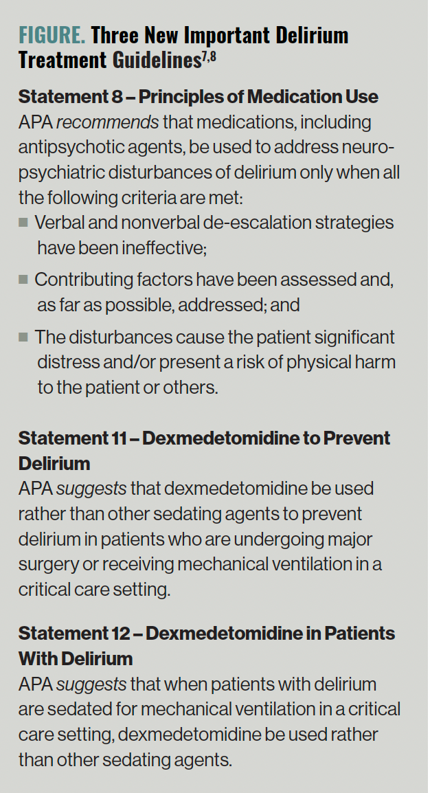At this year’s APA Annual Meeting, I had the privilege of interviewing Mark A. Oldham, MD, associate professor of psychiatry at the University of Rochester Medical Center, and one of the authors of these updated guidelines.9,10 During our discussion, Oldham said that one of the most significant changes was the focus on preventing delirium through nonmedication protocols, adding that 40% of all deliriums are preventable. Additionally, he emphasized that antipsychotic medications are not recommended for the treatment or prevention of delirium or for managing delirium itself. Rather, only when agitation or a discreet neuropsychiatric disturbance such as perceptual distortions causing significant distress are present in a patient with active delirium should an antipsychotic medication be used (Figure) and for the shortest time possible. One of his comments that really resonated with me was that “delirium is not an antipsychotic deficiency syndrome.”