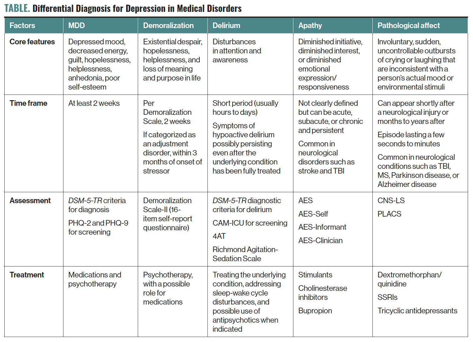 Depression is usually diagnosed and evaluated based on the presence of affective symptoms only. In contrast, other symptoms, especially cognitive symptoms, are often overlooked and may be critical for accurate diagnosis, treatment, functional recovery, and the patient’s quality of life.13,25 It is important to distinguish depression in neurological conditions from other depression mimics, including apathy, demoralization, pseudodementia, hypoactive delirium, and pathological affect, which are described in the