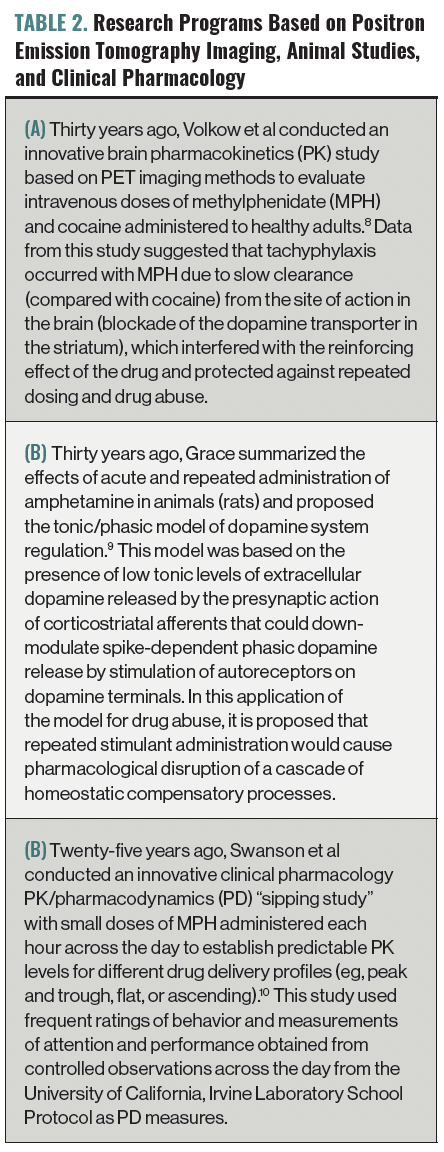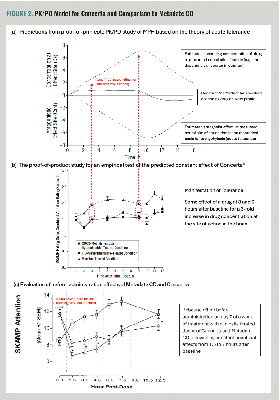 In the RCT phase of the MTA study, an approved and available sustained-release (SR) formulation of MPH (20 mg Ritalin SR) was not evaluated. In this era (1994-1998), it was rarely prescribed in clinical practice, based on a consensus that a once-a-day administration of SR-MPH was less effective than a dose-equivalent regimen of IR-MPH (10 mg twice a day) due to acute tolerance (tachyphylaxis). Decades ago, basic science studies addressed how neural processes associated with the neurotransmitter DA may underlie tachyphylaxis. Volkow et al applied positron emission tomography (PET) imaging methods in human adults, and Grace applied microdialysis and electrophysiology methods in animals.8,9 Also, Swanson et al applied clinical pharmacology methods in children with ADHD in the University of California, Irvine Laboratory School Protocol to provide data for pharmacokinetic/pharmacodynamic (PK/PD) analyses of the effects of experimental drug delivery profiles.10 These research programs provided converging views of the neural effects of stimulant drugs that theoretically contributed to tachyphylaxis after intravenous or oral administration of MPH (see