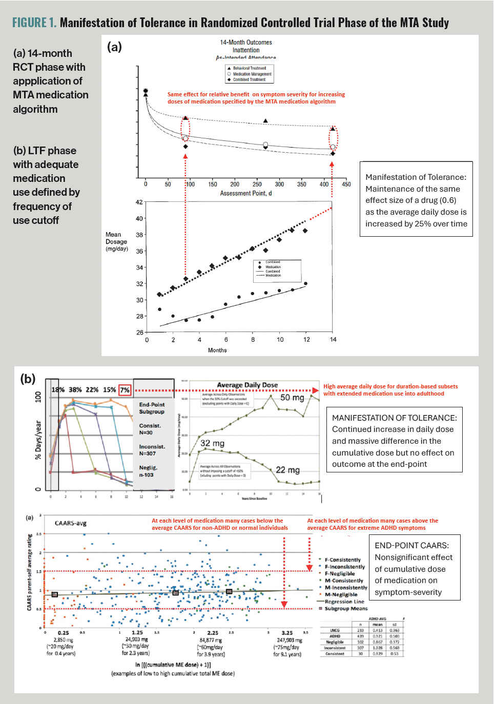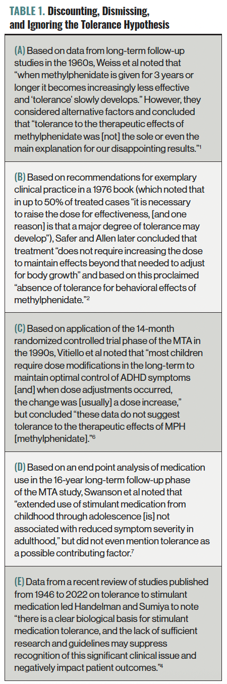 The hypothesis of tolerance to stimulant medication during treatment of attention-deficit/hyperactivity disorder (ADHD) is not new. For 50 years, it has been considered but not embraced; there is a long history of discounting or ignoring the contributions of tolerance to the dissipation of benefit and discontinuation of medication during long-term treatment.1,2 Also, the possible presence of long-term tolerance in the 16-year Multimodal Treatment of Attention Deficit Hyperactivity Disorder (MTA) study was not recognized or reported.3 The presence of tolerance offers a plausible hypothesis for the absence of evidence on the effectiveness of long-term ADHD treatment with stimulant medication.