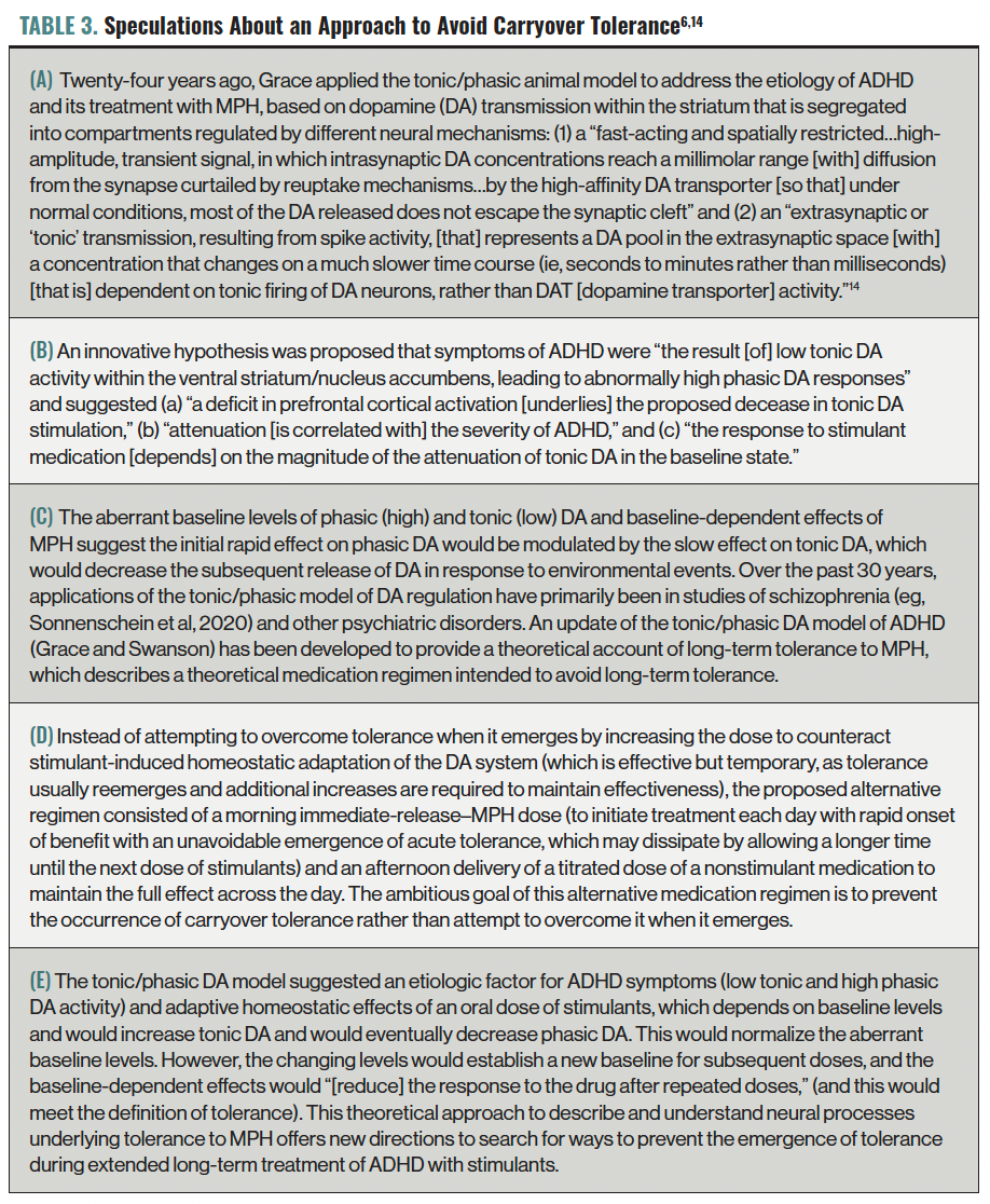 In 2025, as in 1995, the ADHD field faces critical questions about an enduring absence of evidence for the effectiveness of long-term treatment of ADHD with stimulant medication (Cortese et al), but now long-term refers to “more than a decade” rather than “for at least 1 year.”13 One side of this formal debate suggested the plausible hypothesis that long-term tolerance occurs during uninterrupted extended use of currently available formulations of stimulant medication for ADHD, and this undermines the continuation of relative effectiveness of extended uninterrupted treatment for more than 2 to 3 years. The initial application of the tonic/phasic DA model to ADHD (Grace) provided plausible theoretical accounts of an etiology of ADHD (low tonic DA) as well as neural adaptations to response to stimulant medication (increased followed by decreased phasic DA).14 In a forthcoming article, an update of this model summarizes the theoretical basis for 2 common strategies to deal with the dissipation of effectiveness of medication that is presumed to be a consequence of DA-based neural adaptations that underlie tolerance: (a) an increase in daily dose to overcome tolerance (and repeat this as needed with a goal to maintain full benefit) and (b) a temporary cessation of medication to reset the homeostatic balance of tonic and phasic DA systems (and then restart medication at a lower dose that may regain the previous short-term effectiveness).15