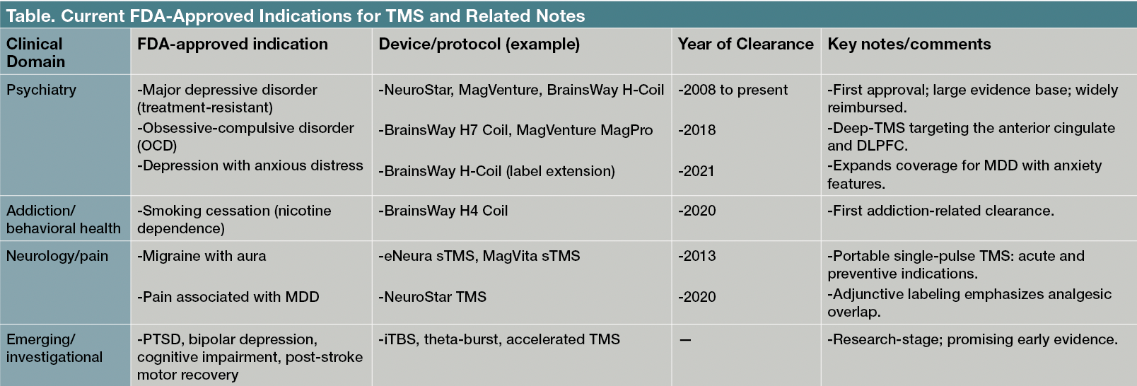TMS’s safety profile is favorable in clinical practice, with transient scalp discomfort or headaches most common; seizures are rare when protocols and precautions are followed.4,5 Contraindications include metallic cranial implants, cochlear devices, or active epilepsy. Clinicians should verify payer criteria carefully, since off-label applications of TMS for anxiety or performance enhancement are rarely covered. Collaborative care across psychiatry, neurology, and sports medicine can ensure ethical and financially realistic implementation (